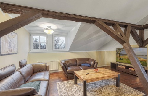 Escape from everyday life and spend relaxing days in this elegant holiday apartment. The quiet location and the lovingly designed interior provide the ideal basis for relaxing holiday moments as a couple, with family or friends. Experience a living ambience with character. The spacious living area under the roof impresses with its open beams, warm colours and stylish furniture. Enjoy film evenings together in the TV area or read a good book on one of the comfortable sofas or armchairs. Use the large dining table for meals together or a cosy breakfast. The modern kitchen allows you to prepare your own meals with ease. Start the day with a hot coffee and a delicious breakfast at the small dining table in the kitchen.