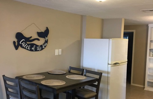 2 bedroom with queen beds, queen sleeper sofa in living room & blow up mattress if needed is available. 1 bath with shower. Full kitchen with stove, dishwasher, refrigerator, micro wave , coffee pot, blender, dishes, silverware, pots & pans, & more. Washer & dryer in laundry room. Water view from living room & kitchen. Screened in porch & patio with outdoor table & chairs. Boat ramp, swim dock & park for children . Central Heat/AC, fireplace. Outdoor table to eat on & outdoor furniture on screened in porch. Grill outside for grilling