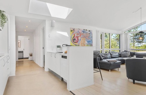 Modern wooden vacation home of beautiful architecture. The location is excellent, just 50 meters from the beautiful Boeslum bathing beach - one of the best in the area. From the house and property you have a beautiful view of the sea and to Jernhatten, a good fishing spot. There are good surfing opportunities and you live not far from the beautiful town of Ebeltoft.