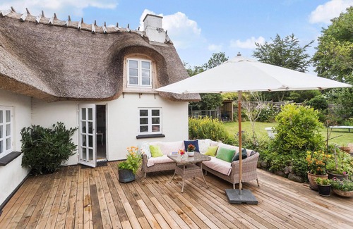 Experience Danish cosiness in this idyllic thatched-roof house with a beautiful garden and wooden terrace.
