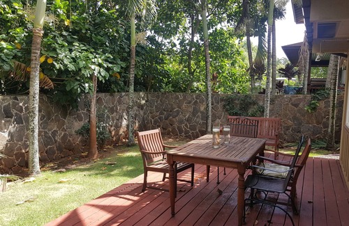 This is a great studio with private back yard and lanai. Comes with a queen bed, couch that pulls out to a bed, fully stocked kitchen, bathtub, and gas grill. Laundry is on-site, and gated parking for your car. Newly installed split AC system is heavenly!