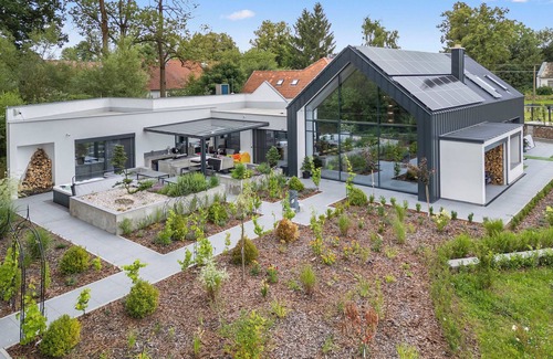 "Ayurvedic Palace", 7-room house 250 m2 on 2 levels. Modern and luxurious furnishings: large living room with hydro massage bath and TV. 1 room with 1 double bed, shower/WC and TV. Walk-through room with shower/WC. 1 room with 1 double bed and TV. Exit to the terrace. 1 room with 1 double bed and TV. Exit to the terrace. Open kitchen (oven, dishwasher, 4 induction hot plates, kettle, microwave, electric coffee machine, Capsules for coffee machine (Nesperesso)) with dining table. Hydro massage bath. Upper floor: 1 room with 1 double bed, shower/WC and TV. 1 room with 1 double bed, shower/WC and TV. Terrace. Terrace furniture. Facilities: Internet (WiFi, free). Please note: non-smoking house. Maximum 2 pets/ dogs allowed. No lift. The dominant feature of this property is an open living room with an unconventional duplex solution (ceiling height 9 meters). Teppanyaki style with seating for 10 people - suitable for cooking courses or other forms of shared gastronomy, which is also reflected in the kitchen equipment: Professional MIELE coffee machine, 3x AEG oven, ice cream maker, chocolate fountain, pancake maker and other professional kitchen equipment. Double-sided fireplace. Indoor hydromassage bathtub for 6 people, 190 diagonal TV, home cinema. 3 x highly efficient electric massage chair with 180 relaxation programs. The indoor Tepanyaki is followed by a summer kitchen with seating for up to 20 people with a grill and tap equipment and cooling for 4 drinks. Private outdoor Swim Spa hydro massage bath with countercurrent (length 4 m). On request: 3 x rooms with 1x bed and 1x double bed (180 cm), shared bathroom with shower and toilet.