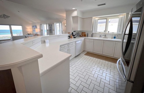 The bright and open floorplan offers incredible ocean views and includes a large living area with plenty of space to spread out and kick back after a fun filled day on the beach. The dining table has seating for 6 and is the perfect spot to enjoy meals together while sharing stories of the day’s adventures. The kitchen comes fully stocked with all the necessities of home and offers bar seating for 4. It also offers a water filtration system, and the kitchen has filtered water available. Step out onto the covered oceanfront deck to feel the ocean breezes, listen to the waves crash, and watch the dolphins swim by.