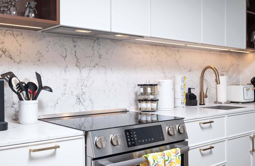 The gourmet Kitchen is fully equipped with everything you need including dishes, glasses, cutlery and pots and pans. The kitchen features Shaker-style birch cabinets and tile floors, granite counter tops and full-size Energy Star GE s stainless steel appliances (four burner stove, oven, microwave, dishwasher and side-by-side full-size refrigerator with ice maker), toaster, and coffee maker. Coffee, tea and sweeteners are provided. *disclaimer* pictures might be different than the real apartment because we have multiple units in the building and we do have varieties of furniture items. Parking is free for monthly stays*.