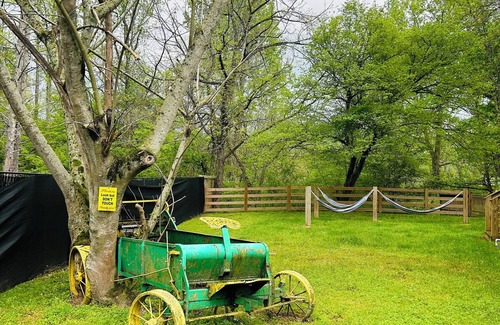 Experience true country charm at this peaceful Smoky Mountain retreat. Listen to the babbling brook from the spacious yard enjoy it from the private dock. The setting offers the perfect escape with an antique, horse-drawn plow lawn decoration, a large yard featuring hammocks, picnic tables, and a wood-burning firepit.