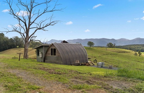 Baker's Hut is a furnished cabin with a plush king-sized bed and daybed that can be converted to a single bed. It has breathtaking views over the working farm and beyond to Dorrigo Mountain range, with a deck out the front to take in the view. The cabin only has a very small solar power set-up so only enough electricity for basic lighting, camp fridge and pumps in the bathroom and kitchen.