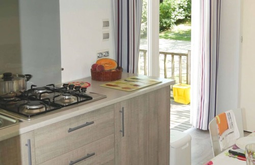 "Happy Comfort", 3-room mobile home 25 m2. Object suitable for 4 adults + 1 child. Practical furnishings: living/sleeping room with 1 sleeping facility, dining table, electric heating and air conditioning. 1 room with 1 french bed (140 cm, length 190 cm). 1 room with 2 beds (70 cm, length 190 cm). Open kitchen (4 hot plates). Shower/WC. Air-conditioning (extra). Terrace partly roofed. Terrace furniture, electric barbecue (portable), deck chairs (2). Facilities: mosquito net. Parking (1 car). Please note: non-smokers only. KE19004810