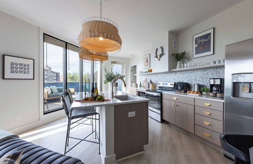 This two-bedroom apartment has a spacious, airy layout perfect for a group looking to connect and explore the city. You’ll find chic, Nashville-inspired design and a vibrant, playful atmosphere. The living room has a sofa and TV ready for movie nights, while the fully equipped kitchen boasts a full suite of appliances and everything you need to make at-home meals and snacks a breeze. There's seating for 4 at the dining table and additional barstool seating at the island counter.