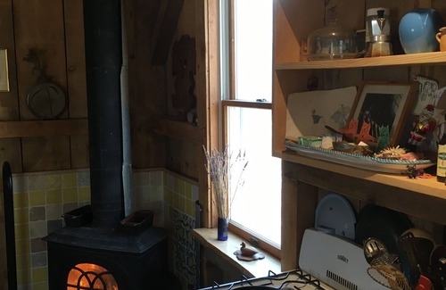 This is the perfect romantic getaway for one couple, but two couples or a couple with kids can stay here comfortably. Those who used to rent the octagon will remember the timber-framed barn that has now been transformed into a beautifully crafted, cozy, and fully equipped two-story house. Open living room with a recently installed heat pump and a woodstove keeps the house cozy in winter and cool and dry in the summer.