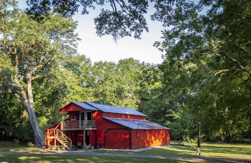 Our barn loft suite is situated in the country under a several 250 year old oaks draped with Spanish moss. The room is equipped with a king size bed and a couple couches that face french doors overlooking the property. There is a small kitchenette area that has sink, small refrigerator, microwave, coffee maker, toaster, plates & utensils, and small table for meals. Outside of the room is a large pond for fishing, and an outdoor kitchen for grilling. All guests are allowed to fish in the private stocked fishing pond.