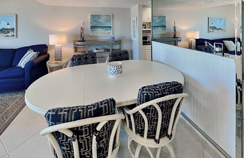 The fully equipped kitchen features modern appliances, granite countertops, and all the essentials you need for easy vacation cooking. An open dining area offers seating for four with ocean views.