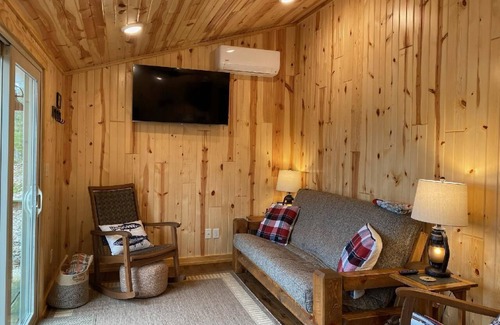 600SF 2BR, 1 bathroom cabin right on shore. Fully outfitted kitchenette. Glass door and picture windows overlook lake. Wifi, Roku TV, Netflix, and AC.