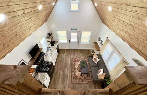This tiny cabin is a two bedroom and 1 bath. Downstairs you have a spacious living room and kitchen that includes everything you would need for a comfy stay. Couch does fold out to sleep one adult. There is a bar table to eat or do your computer work at. The kitchen has a refrigerator, stove, microwave, drip style coffee maker and all the essentials needed to eat, cook and drink. The downstairs bedroom includes a queen-size bed and cubical dresser. The upstairs bedroom is accessed by climbing the rustic ladder where you'll find two full-size beds. The bathroom is downstairs and is very roomy. It has a walk-in shower, toilet and vanity. The bathroom does come with a set of toiletries for your trip which includes; shampoo, conditioner, body wash, and lotion.