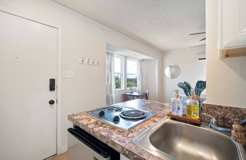 Escape to this adorable studio in picturesque Bastrop. This unit is in a triplex converted from a single family home. The unit has a private entry and is perfect for business travelers or an extended stay. Included is high-speed internet with a dedicated workspace, as well as a large smart TV where you can access your streaming accounts (Netflix, Hulu, etc). The outdoor space is a pine-tree covered double lot in Bastrop. This space includes a kitchenette with a stove top, microwave, mini-fridge & Keurig. If booking for 30+ days, a brief rental agreement is required.