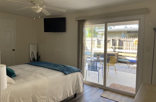 Fully equipped kitchen lets you prep beach lunches or relaxing dinners after exploring. Primary bedroom opens onto covered patio with seating and has a connected bathroom with private outdoor shower and washer/dryer. Two bedrooms have a large desk workspace. Each bedroom has a closet and lockable door. Flat screen TV's with streaming channels (no cable) in living room and 2 bedrooms. Hall bathroom has tub/shower combo.