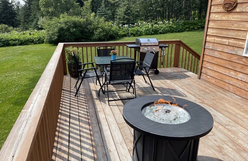 The Otters Den awaits you! New private deck construction is complete. Completely renovated in 2021 with brand new kitchen, appliances, floors, paint, bath, luxury linens and bedding. The Otters Den is located on the 2nd floor of our 2 story cabin with stunning views of the Spit and Kachemak Bay. The Otters Den has over 800 sq. feet with 2 bedrooms and 1 bath complete with gas grill, gas fire pit, patio table and chairs. Shared laundry facility and wood fire pit.