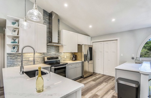 ⭐ Walk into Beach and Bay for Days, and you ll be greeted by the all-new chef s kitchen designed from the ground up with everything one could dream of glass tile back-splash, quartz counter tops, under-mount surface lighting, separate work area with microwave drawer, and all new stainless-steel LG advanced appliances. The most enticing appliance is the refrigerator with a door-in-door feature, making it easy to grab a cold one, wine, or other beverages. You love the multi-speed vent and hood that goes up to the vaulted ceiling, the huge granite composite sink, and the professional pre-rinse faucet let s get cooking!