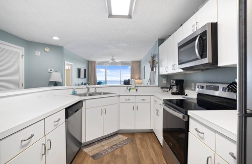 Beach Club Catalina 608 has an open floor plan. This 2-bedroom 2 full bath, 1041 square feet condo can sleep 6. The living room is furnished with a sofa sleeper, 50” 4K HDTV, and a Bluetooth speaker that pairs with your devices. The master suite has a queen bed with a private bath and separate vanity area. The 2nd bedroom offers a queen bed and full bathroom. There are HD smart TVs in both bedrooms. The kitchen is fully stocked with all appliances, microwave, Keurig coffee maker, utensils, dishes, and cookware. A washer/dryer is in the utility area. The condo has free Wi-Fi to always keep you connected.