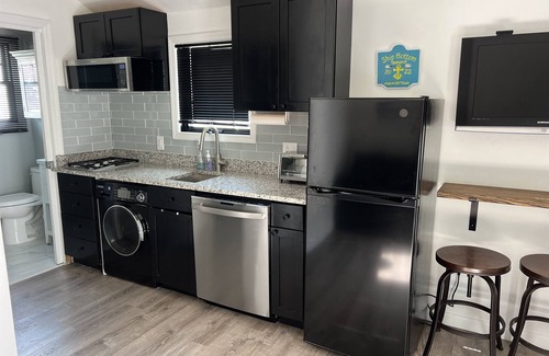 1 bedroom cottage 3 houses from the beach. Located at the rear of our main house. Can accommodate 3 (maximum 2 Adults and 1 child/teenager). Private patio area and outdoor shower. Walk to shops, restaurants, ice cream, mini golf, liquor store, coffee and bagels. Two TVs with Roku, refrigerator/freezer, microwave, toaster oven, Keurig, dishwasher, small all-in-one washer/dryer. AC. 2 Beach Badges. 280 sq ft.
