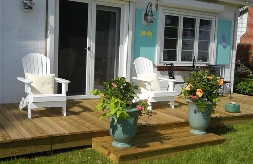 Water views can be seen out of three sides of the cottage. Enjoy our waterside deck that runs the full width of the cottage and has a gas grill (we provide the propane tanks), dining table and chairs, and chairs for relaxing and watching the river sights. A second larger vintage wrought iron dining table is located in the waterfront yard.