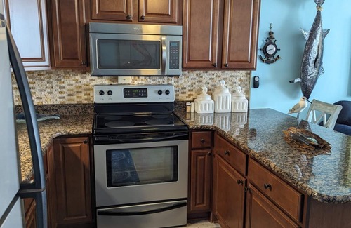 The Kitchen is new with dishes, pots and pans, that you would find in your own home. Lots of extras too. Beach Dreams provides a small but ample table for four and a counter that seats three.