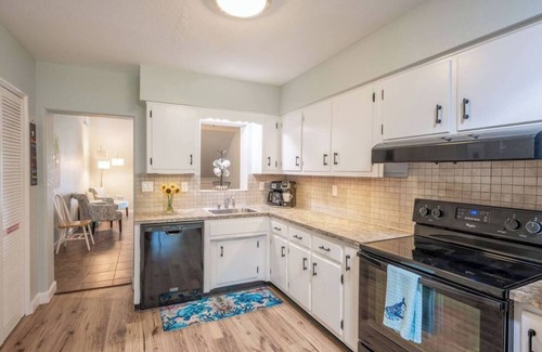 KITCHEN: Dishwasher, electric stove/oven, refrigerator, microwave, cooking basics, dishware & flatware, spices, breakfast bar w/ seating, coffee maker, toaster oven, blender, kettle, trash bags & paper towels