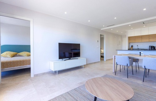The bright and modern apartment with top furnishings invites you to relax. Inside, warm color details form a harmonious contrast to the white and create a pleasant atmosphere where you will feel at home. Prepare delicious meals together and enjoy them on the balcony. If you prefer short distances, you can refresh yourself early in the morning in the communal pool and take your first dips. A little later, you can quickly reach the sandy beach on foot.
