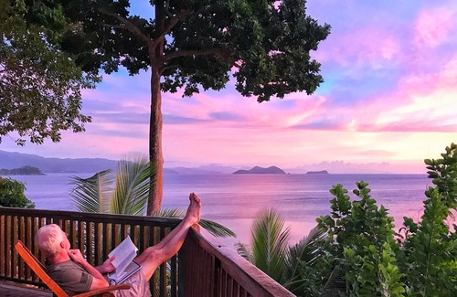 Our villa is our private vacation home in the tropics. It is beautifully constructed and furnished with natural materials, nicely decorated to make this home a special, relaxing place for anyone who wants to stay. It is situated on a hillside overlooking the ocean with beautiful sunsets. It is large enough to accommodate a small family and has plenty of room for everyone. Two bedrooms are available for our guests with a custom made queen four poster bed in the Masters Bedroom, a bunk bed and double bed in the other bedroom, 2 bathrooms with flushing toilets and hot showers using solar heater. The living room and the dining room are located in the front of the house where the view of the ocean and sunsets are best seen. The entire front of the house has sliding door panels which can open all the way for a panoramic view of the ocean. When we vacation here, we usually keep the whole front open (unless it’s raining hard) for a good breeze especially at night. Our villa is constructed to modern standards with a tropical, rustic and vintage design. A new roof was installed this year for durability and better environment for our asthmatic kids.