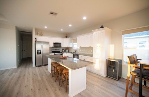 3 BR/ 2 Bth sleeps MAX 8. The on-suite master bedroom features a king bed, double vanity and shower. The second bedroom features a queen bed. The third bedroom features a double bunk with 4 twin beds which top bunks are only suitable for kids. The second bathroom also includes the stackable washer and dryer.