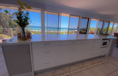 * Huge Caesar Stone island bench in kitchen overlooking the ocean