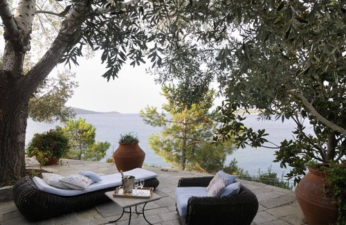 Sheltered from the Meltemi in the calm Pagasitiko Gulf lies the pretty fishing village of Mitzella. Completely off the beaten track and unknown to the vast majority of foreigners, Mitzella takes one back several decades to a time when Greece was a quieter, simpler place. Across the bay rise the mountain ranges of Pelion and the island of Skiathos; the wonders of Meteora are just over an hour away, as is Thermopylae, the Byzantine glories of Salonika are 2 ½ hours away, Delphi is a short trip by car. This is an opportunity to explore a beautiful and lesser known part of Greece. The property, which consists of a main house and a guest cottage, is set in terraced grounds dropping down to the sea, where guests are offered two jetties; a wooden one for boats to dock at and a concrete one dressed with deckchairs and a lovely shaded area with cushioned seating. A tiny sandy beach next to the jetty is great for small children, while other small, shingle beaches are accessed along a footpath. The house also has a pool surrounded by lawn, a tennis court and a speedboat. Designed to follow the contour of the hill on which it is built, the villa offers spacious rooms, terraces and balconies galore and above all, lovely views of the water and beach 30m below. Steps lead down through the garden to the pool, and then continue down to the shore. Wrap around terraces offer different seating, eating and lazing areas for a large group of people.The villa has just been extensively renovated, though keeping the original concept that preserves the Pelion style of hand-made roof-tiles, whitewashed walls, wooden balconies and ceilings, and stone floors. The space, privacy and proximity to the sea make this an ideal house for relaxing with family or friends.