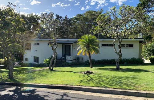 The Ponderosa is a newly renovated 2 bedroom free standing house on a large block 2 minutes walk from Sapphire Beach. The home boasts an open plan kitchen, dining, lounge room with air conditioning, opening out to an elevated north facing patio that has views of the nearby nature reserve towards the beach. Broadband fibre to the premises ensures fast internet and WiFi, The lounge has a large flat screen TV with a WiFi blue-ray player and comfortable lounges. The dining area has a quality sound system with Bluetooth connectivity from your smartphone and a CD player. The covered patio has a gas BBQ and dining setting for relaxed outdoor dining. A separate laundry room downstairs has a washing machine, dryer, iron & ironing board and directly outside there is a six line pull out clothes line near the outdoor shower. For car parking, there is a secure remote control roller door garage. The theme of the property is one of beach side relaxation