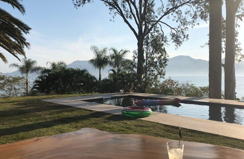 From the balcony you can see the beautiful sea view, located to the north of the island, with access to Siriúba Beach and the secluded Arrozal Beach. The house has on the ground floor, two bedrooms, one suite, a common bathroom, living room with fireplace, kitchen integrated into the room, access to the mezzanine used as a bedroom with 01 bathroom. On the lower floor, we have two other bedrooms with 01 common bathroom. Covered garage, service area and 01 toilet. On the ground we have, swimming pool, dry sauna, a tree house and the shower. House equipped with bed and bath, kitchen with appliances, microwave, 2 refrigerators, freezer, 5-burner stove and utensils. Dorms with air conditioning, living room with ceiling fan, cable TV and WI FI. Balcony with seating and dining table.