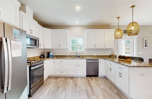 Put your toes in the sand and enjoy the home's large newly fenced yard, heated pool, surrounded by lush greenery and boasting a fire pit, Adirondack chairs, and corn hole. Great for families and pets. Bright and well-updated, the open layout ensures comfortable family time. The living room boasts plush seating and a large smart TV. Steps from here, the gorgeous chef's kitchen displays stainless steel appliances and ample meal prep space amidst a white tile backsplash. When you'd prefer to cook amongst the sea breeze, a gas grill is available outside.