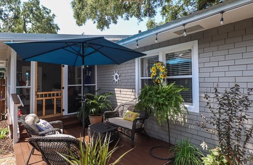 This coastal cottage is one block from the beach & gulf waters. uniquely decorated with original & antique pieces — featuring an upscale beach style mixed with eclectic & beautiful one of a kind pieces. The open-concept-style living room, dining room, and kitchen has several floor-to-ceiling windows filling the space with bright, natural light. The comfortable and spacious living room has an electric fireplace, as well as, a queen-size sleeper sofa. The kitchen, with stainless steel appliances and granite counters, is fully-equipped with everything you need to feel at home, away from home, and the dining room table seats four, with additional seating for four people at the kitchen island.