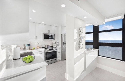 Every room opens up to the balcony. With walls of sliding glass doors facing the ocean, you can relish the one-of-a-kind view as you entertain guests or prepare meals in the deluxe kitchen filled with modern appliances and cookware.