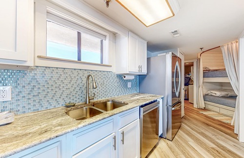 The condo's ocean-view balcony offers a scenic perch to catch the sunrise, but it also makes an ideal spot for drinks. The interior is bright and airy, with lots of windows allowing for strong natural light and additional ocean views. The pleasant, coastal decor sets the tone for your stay, while all-new home fixtures and furnishings provide ultimate comfort and convenience. Gorgeous countertops, a beautiful backsplash, and a suite of stainless steel appliances are sure to inspire gourmet creations in the kitchen. There's a smart TV in the living room and the bedroom, and free WiFi is equipped for web browsing or remote working.