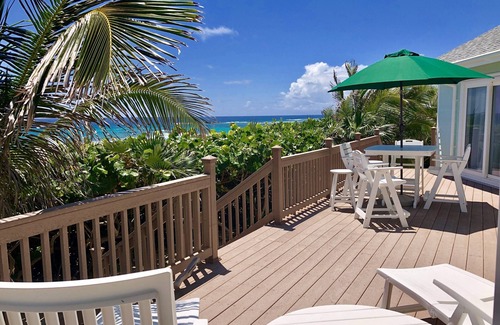 Palm Paradise offers a home with white powder sand right at your doorstep, and crystal clear blue water just steps away. The home is on the Atlantic side of the island featuring wonderful tropical breezes allowing for cooler air and a mostly bug free environment. Dining inside for more elegant meals with a crystal chandelier over the dining table or more casual out on the deck under an umbrella with views of the ocean or the stars and the sound of the waves. Palm paradise has a surf bar and coffee station. The great room has high ceilings with windows that lets in lots of light. All rooms have ocean views and sliding glass doors with access to the outdoor deck. There are climate controlled air conditioners and overhead fans in each room. Each bedroom has it's own private bathroom with a walk-in shower.