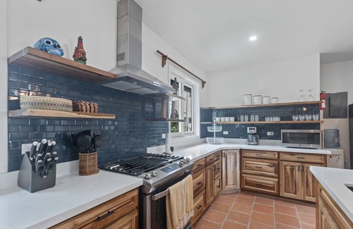 Fully equipped kitchen with a full-sized refrigerator/freezer, microwave, gas range, toaster oven, filter-less coffee maker, garbage disposal, and fully filtered tap water a whole house water filter.