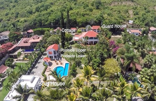 Elegant property featuring 5000 square meters of well groomed gardens and fruit trees oceanfront. Property has two pools and a spa. Nicest property in the area. We also provide 24 hour security, air conditioning and WiFi. The beach in front of the property is big and quiet. Walk 10 minutes down the beach if you want populated. The property has 4 guest houses. Boat house sleeps 4, Lower and upper poolside houses sleep 2, cottage sleeps 2 with a Queen bed. The property has an outdoor kitchen and BBQ. Breakfast is served daily and included in the price. Each house is rented and priced separately.