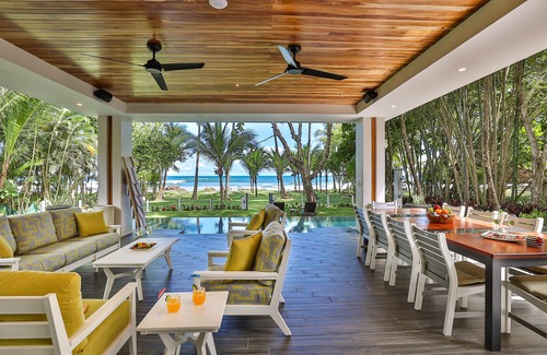 Our villa is Esterillos' newest beachfront luxury home. This brand new beautiful villa is complete with privacy, amenities and luxurious interiors. In addition to interesting architectural details, this gorgeous villa enjoys a prime location! Listen to the sound of the waves crashing right outside your master bedroom balcony or on your large back terrace complete with outdoor living, dining and BBQ. Boasting 5 large bedrooms and 4.5 baths, this villa is perfect for a large group or a family who wants to enjoy time on the beach. There are multiple cafés and restaurants located just down the beach in both directions and several daily happy hour locations that are popular with visitors. Manuel Antonio is just 30 minutes South and Jaco is just 15 minutos North. Come and see for yourself why this home embodies tropical living at it's finest!