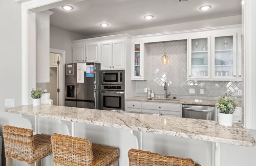 To the right, the kitchen area is large enough to cook a meal for the whole family! The kitchen is fully stocked with everything you should need to prepare all of your favorites and state of the art appliances.