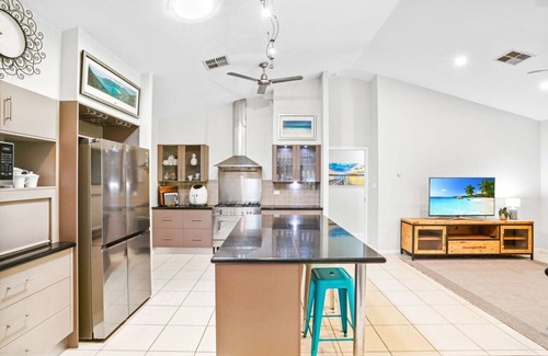 Located just moments from the beach, this modern 5-bedroom home offers the ultimate coastal getaway. With spacious open-plan living, high ceilings, and a fully-equipped gourmet kitchen with stone countertops and quality appliances, it’s perfect for families or groups of up to 9 guests. The home features 2 bathrooms, including an ensuite attached to the master bedroom, providing added privacy.