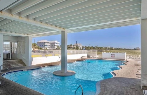 WiFi. The unit has a PUBLIC BALCONY with ocean views facing east of the Gulf of Mexico. A well-equipped kitchen with modern appliances, including a microwave, a stove with an oven, will assist in quick and easy meal preparation. Community perks like a shared, partially-covered, outdoor pool, and a sand volleyball court on the nearby beach and the coin operated laundry.