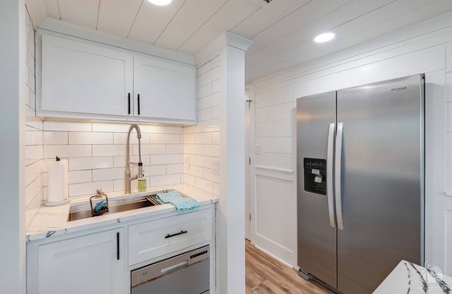 Inside, unwind in the open-concept living room with a pull-out sofa, flat-screen TV, and sweeping Gulf views. The master suite features a queen bed with stunning lake vistas and a private ensuite bath. Kids love the cozy built-in bunks, and the second full bath makes mornings easy. A fully stocked kitchen, in-unit washer/dryer, and thoughtful touches make BeachfrontBliss feel like home.