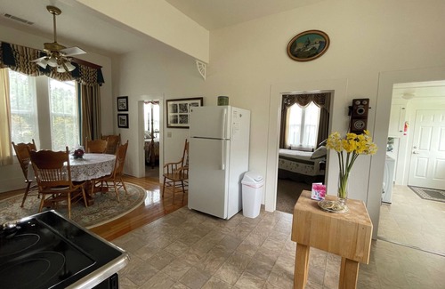 The Beauregard is a comfortable Victorian home built in 1893. There are 2 bedrooms and 1 bathroom that sleep 4 people. The home is walking distance to downtown Ferndale with its Victorian architecture and unique shops and restaurants. Relax in the spacious living room with a gas fireplace that provides coziness at the flip of a switch, while you hang out on the comfortable couches and watch the Roku tv or read a book. The dining room that seats 6 flows into the kitchen with original antique cabinets and old fashioned looking, modern range. One bedroom has a queen bed and a tv with blue ray player. There are a few movies to watch that were filmed in Ferndale. The other bedroom has a double bed. The bathroom includes a shower over the bathtub. The home is furnished with antiques and reproduction furniture. Outside the yard has green grass and a variety of plants included roses and camellias. The backyard has a patio with a table with umbrella and four chairs. There is also chaise lounge, a built in grill, and a fountain.