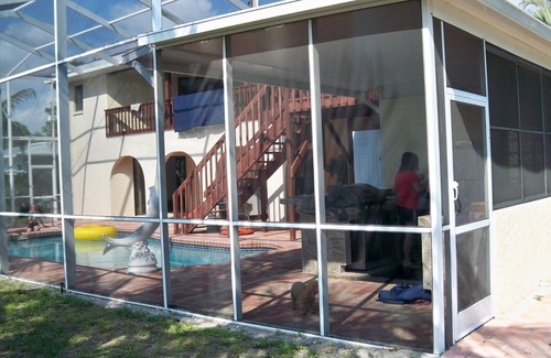 Quiet neighborhood on deepwater canal 5 minutes from the intercoastal waterway and the Gulf of Mexico beaches. Beautiful modern Spanish style two story with hardwood floors and open floor plan. Large downstairs game room with pool table and other games. Downstairs has hideaway sleeping for 4 more making this easy accommodations for 8. King size bed in Master bedroom and queen size 2nd bedroom. Deepwater boat slip on wide canal. great fishing and boating to the nearby beaches. Heated pool and Spa.
