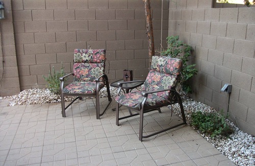 Professionally renovated! Enjoy the Winter / Spring months in the warm comfort of the Valley of the Sun. Come to our townhome and be our guests to escape the cold of winter. Our townhome offers all the conveniences of being at home…. and much, much More!! Completely professionally painted. All new carpet. 18' tile on first floor and baths. Over 1500 sq ft. 2 Story. 1 car garage with storage available for our guests, remote and keyless entry. Expansive, enclosed gated/locked patio with West and North green spaces. Seating areas, pub style patio set and a Patio Bistro grill. 3 Bedrooms - Large Primary with Walk in Closet, ensuite bath with walk in Shower. King Bed. 2 guest bedrooms with Queen Beds. 2nd Bath is a tub/shower combination with an extended vanity. All Bedrooms on second floor. First floor has a large living/dining area. Sectional sofa and modern style recliner. Dining table for 6 and bar height counter seating for 2. Custom window treatments including white cornice boards in the living and dining. Updated lighting. Large 1st floor laundry with full sized washer and dryer, plus MUCH storage! Kitchen boasts cherry stained 42' maple cabinetry. Glass tiled back splash. Fully Stocked. Community offers large resort-like pool and 12 person jacuzzi, walking trail in the soccer field, tot lots and 1/2 basketball courts. Pets Considered. Inquire with owners with specifics on your pet. Owner Approval Required.