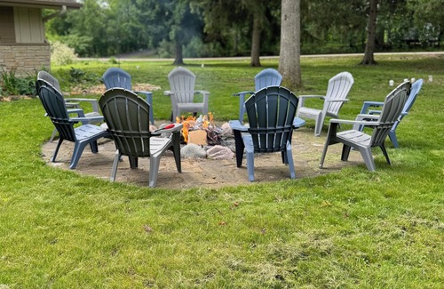 This sprawling ranch is set on a tree-lined lot and is one block from the lake. Outside, enjoy lounging on the shady front porch or on the sun-drenched back patio. The patio also includes an extra-large gas grill. A huge, stone firepit awaits evening bonfires and roasting smores. Inside the home, the main floor provides 3 bedrooms with queen-sized beds, a full bath, a half bath, and hardwood floors. The large, open kitchen and dining area are perfect for entertaining. A farm-style dining room table and huge island provide plenty of seating for a large family. The rest of the first floor consists of a big living room, game room, and huge family room complete with a 75-inch TV and seating for 14+.