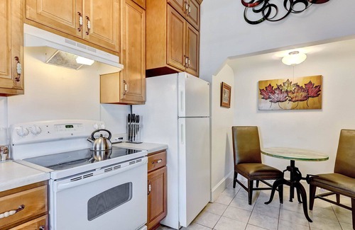 Several units offer full kitchens, while others offer kitchenettes. The kitchenettes are equipped with a refrigerator/freezer, dishwasher, induction burner, microwave and toaster oven. Each apartment is fully stocked with dishes, cutlery, utensils, cookware and everything you need to prepare a great meal or whip up a snack. A coffee maker is found in each unit to prepare your morning coffee. Each unit also has a stacked washer and dryer for all of your laundry needs, and you'll have an ironing board, iron and all the hangers you need. Each unit has its own full bathroom, fully stocked with linens and towels, featuring either a tiled walk-in shower or a tub/shower combo.
